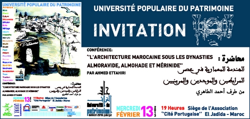 La série des conférences de la première édition de l’« université populaire du patrimoine » se poursuit avec une nouvelle rencontre sous le thème : « L’architecture Marocaine sous les dynasties Almoravide, Almohade et Mérinide » qui sera animée par Ahmed ETTAHIRI, archéologue, historien de l’art islamique et enseignant-chercheur à l’Institut national des Sciences de l’Archéologie et du Patrimoine (INSAP).