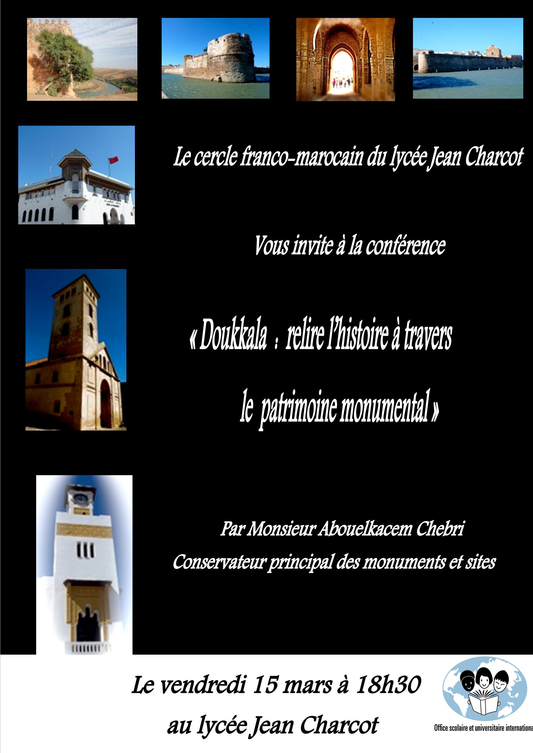 conférence patrimoine Doukkala à CharcotLe  Cercle Franco-Marocain du lycée Jean Charcot vous invite à la conférence : Doukkala: Relire l’histoire à travers le patrimoine monumental,par le conservateur principales monuments et sites: Aboulkacem Chebri