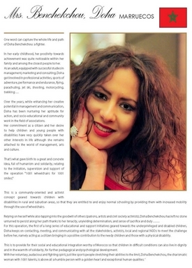 L’amie de tous les handicapés «1 001 fauteuils roulants pour 1 001 sourires» tel est l’objectif de Doha Benchekchou qui est entrée dans le monde humanitaire,très jeune. Nous lui souhaitons plein succès dans sa noble mission.
