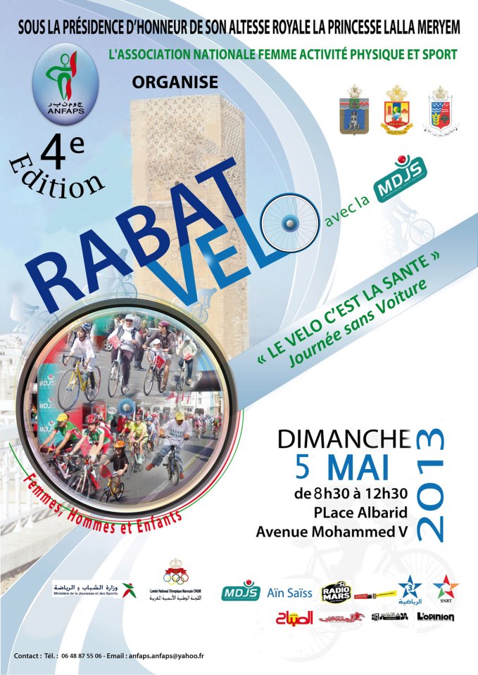 Maintenant que les demi finales de la champions league sont évacuées…Place à Rabat Vélo, une demi journée sans voiture au centre de la capitale, avenue Mohammed V à partir de 9h dimanche 5 mai. Venez nombreux avec votre vélo pour pédaler en toute tranquillité dans une ambiance festive. Venez en famille c’est encore plus agréable. Vous êtes les bienvenus sur n’importe quel type de bicyclettes et à tous ages.
