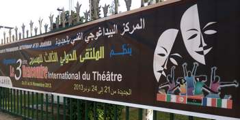 Vous n’avez pas devant vous un  »texte à fautes » , mais une pancarte pleine de fautes. Avant de suspendre cette affiche,  au moins il y a un responsable qui doit voir la forme et le contenu du texte écrit ,et certainement demander aux organisateurs de cette rencontre internationale du théâtre,d’aller corriger leurs fautes.