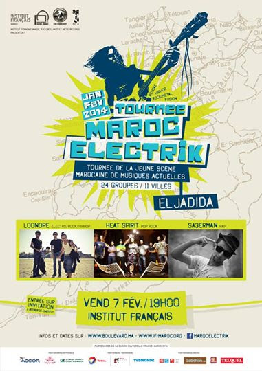 L’Institut français d’El Jadida en partenariat avec EAC-L’Boulvart et Metisrecords organisent la Tournée Maroc Electrik avec la participation de grands artistes tels que « Heat Spirit« , « Sa3erman » et » Loonope » qui s »illustreront sur la scène du théâtre AFIFI le Vendredi 07/02/2014 à 19h