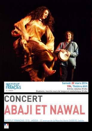 L’Institut français d’El Jadida organise un concert d’Abaji, avec à ses cotés Nawal, ce Samedi 22 mars 2014 à 19h au théâtre Afifi, un spectacle en exclusivité à El Jadida mêlant rythmes et sonorités orientales.